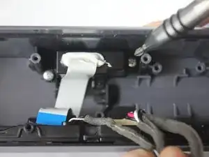Отсоедините разъём кабеля питания, показанный на изображении, с помощью пластикового инструмента. Подденьте инструмент под кромку вилка; из-за небольшого размера и неудобного угла придётся поднимать разъём пластиковым инструментом, как показано на изображении.