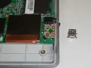 Найдите четыре соединителя на печатной плате и порту зарядки, которые необходимо запаять.