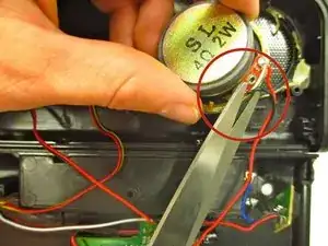Используйте термоклей, чтобы закрепить новый динамик. Припаяйте черные и красные провода обратно на место.