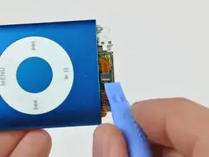 Вставьте инструмент для вскрытия iPod между внешним корпусом и фиксатором дисплея.