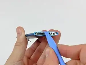 Используйте край инструмента для вскрытия iPod, чтобы отделить выключатель блокировки от клея, который крепит его к верхнему краю дисплея.