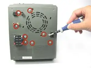 Снимите восемь винтов Филлипс #2 длиной 9,5 мм, которыми задняя панель крепится к устройству.