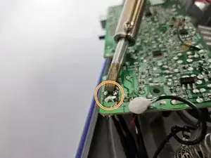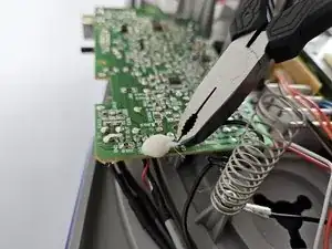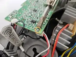 Используйте паяльник, чтобы нагреть два металлических контакта, как показано на фото, и аккуратно потяните белый разъём с проводами до отсоединения.