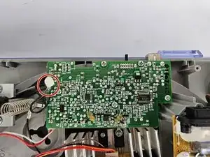 Чтобы отпаяать белый разъём с красным и белым проводом в углу предусилителя, нагрейте два металлических контактных вывода на противоположной стороне предусилителя, как показано, и аккуратно потяните белый разъём до отсоединения.