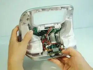 Осторожно снимайте нижнюю панель. Пластиковый язычок, расположенный рядом с правым динамиком между верхней коричневой радио-материнской платой и нижней зелёной аудио-платой расширения, может повредить устройство, если нижняя панель снимается некорректно.