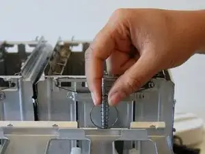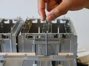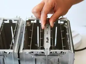 Снимите пружину, обёрнутую вокруг металлического стержня спереди тостера, расположенного за белым пластиковым держателем рычага.