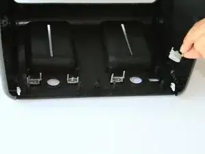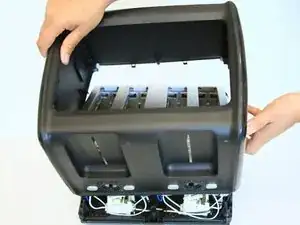 Используйте пластиковый инструмент для вскрытия, чтобы снять верхнюю металлическую панель, поддев 4 верхних металлических защёлки вверх. Они смогут пройти через отверстия и быть вытянутыми вверх.