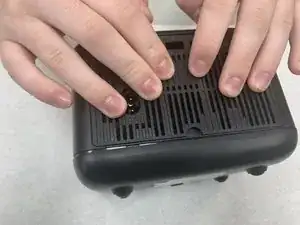 Прикрепите панель обратно к проектору. Сторона, противоположная вырезу, которым вы открывали панель, имеет защёлки — эта сторона должна быть вставлена первой.