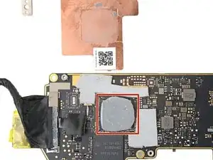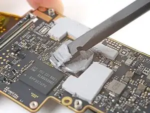 Используйте отвёртку Torx T5, чтобы выкрутить винт длиной 3.5 мм, фиксирующий рамку материнской платы.