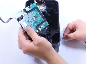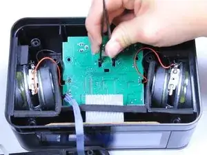 Когда порты на задней части платы смещены и упёрлись в заднюю стенку часов, используйте пинцет, чтобы поднять плату с нижней части часов, продолжая продвигать радиоприёмную антенну через боковую стенку часов по мере подъёма платы.