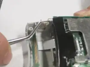 С помощью пинцета осторожно снимите металлическую петлю, прикрепленную к плате, из ее пластикового корпуса на левой стороне отсека для аккумулятора.