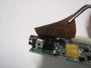 С помощью пинцета осторожно подденьте и отогните тонкую медную пленку, покрывающую разъем для наушников.