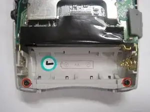 С помощью отвертки Phillips #00 снимите два винта по 5,5 мм, расположенные в нижних углах отсека для аккумулятора.