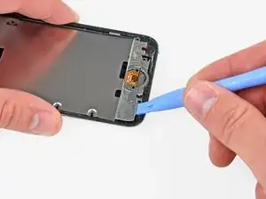 Вставьте кромку инструмента для вскрытия iPod между передней стеклянной панелью и пластиковой рамкой около кнопки «Домой».