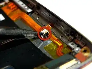 Удалите старый разъём наушников с платы логики, отсоединив ленточный шлейф разъёма наушников от платы при помощи лопатки.