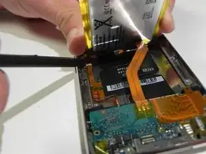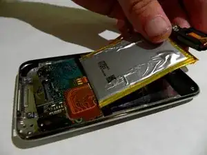 Возьмите батарею рукой и осторожно поднимите её до угла примерно 45 градусов относительно оставшейся части iPod.