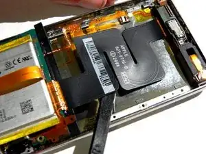 Разверните металлический лоток дисплея к верхней части iPod, следя за ленточным кабелем, соединяющим батарею с платой логики.