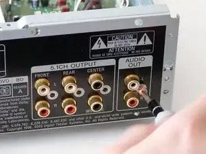 RCA-разъёмы — это красные и белые гнёзда на задней панели BDP‑S1, принимающие аудиовходы. Если один из них выходит из строя, плату нужно снять, чтобы заменить разъёмы.