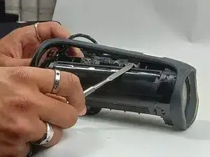 Сосредоточьтесь на стороне колонки, где находится разъём зарядки, и осмотрите место, где ранее был пассивный излучатель.