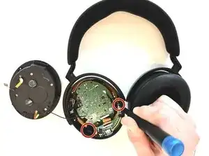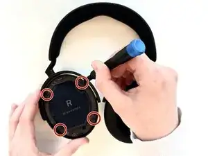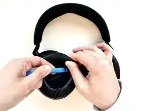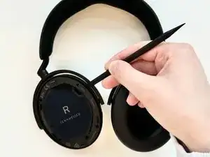 На правом наушнике вставьте инструмент для вскрытия в зазор между амбушюром и корпусом динамика.