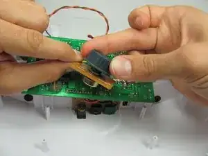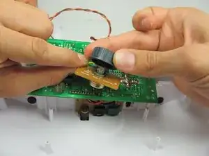 Удалите два винта Phillips #1 длиной 11 мм, крепящих маленькую коричневую плату к пластиковому корпусу.