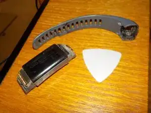 Это примерно то же самое, что и в предыдущем шаге, но нужно избегать кнопки. Я использовал пластиковую лопатку, чтобы поднять ремешок над кнопкой, но, возможно, вы сможете добиться похожих результатов с помощью маленькой отвертки с плоским наконечником.
