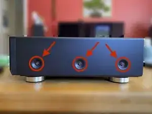 Отвинтите четыре золотистых винта на задней панели, удерживающих верхнюю крышку, с помощью отвёртки Phillips #2. Обратите внимание, что эти винты похожи на многие другие на задней панели, но удалять нужно только эти четыре.