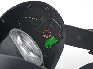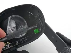 Вставьте отвертку Torx T6 в отверстие рамки уплотнителя лица, чтобы снять фиксирующий винт, удерживающий левую сторону ремня наушников.