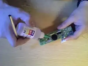 Очистите остатки флюса на плате изопропиловым спиртом и кисточкой для травления.