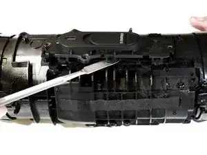 Используйте лопатку, чтобы раскрыть край с резиновой текстурой, освобождая оставшиеся пластиковые защёлки.
