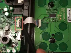 Используйте лопатку, чтобы откинуть зажим, который удерживает шлейф, и отключите его от материнской платы.