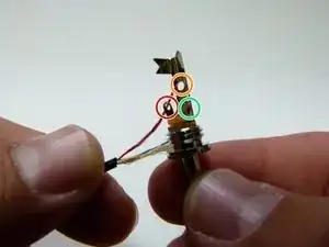 Протяните красный провод через отверстие контакта, соответствующего правому динамику. Оберните провод вокруг контакта несколько раз, затем припаивайте на место.