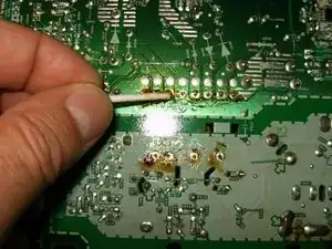 Запаяйте новый трансформатор на место. Коричневатый остаток — следы флюса. Плату можно очистить изопропиловым спиртом после пайки.