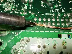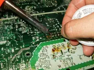 Нанесите флюс на оплётку для удаления припоя и выпаяйте контакты.