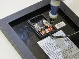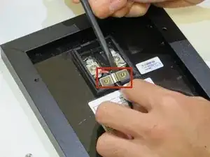 Отверните два винта Phillips #2 длиной 5 мм, удерживающие силовой кабель на месте.