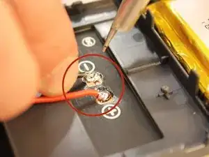 Вам нужно было сломать пластиковые штифты, которые удерживают печатную плату на месте ранее в этом руководстве по ремонту. Вы можете исправить их достаточно хорошо, удерживая полуразогретый паяльник на них, чтобы они расплавились и снова удерживали печатную плату на месте.