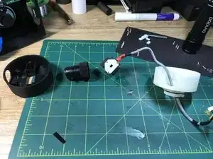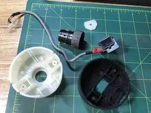 С объективом над крошечным экраном поместите экран и объектив обратно в большую белую половину колеса. Плата плотно встанет в пластиковые кромки, удерживая её на месте, а объектив войдёт в белые пластиковые кромки в половине колеса. Возможно, придётся повернуть объектив, чтобы правая сторона встала на место.
