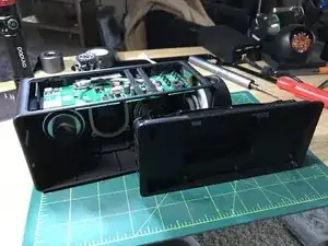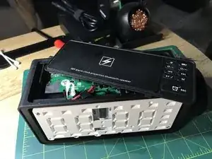 Снимите винты, которые крепят переднюю тёмную пластиковую облицовку к часам. Это позволит снять половину внутренней части часов. В ней расположены динамики и вращающееся устройство проектора.
