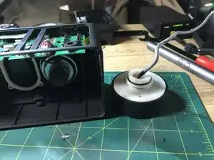 Собирайте в обратном порядке, пропуская серый кабель проектора вверх и под плату часов и выводя его к верхней части циферблата, затем подключите обратно к плате. Установите на место большой тёмный корпус циферблата с уже установленным проекционным колесом и закрутите винты. Поместите батарею в тёмный корпус циферблата и припаяйте заново.