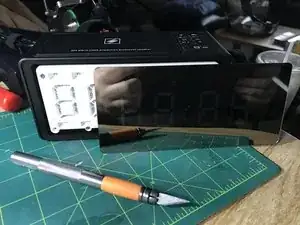 Острым ножом подденьте отражающую стекловидную панель с угла и снимите её с передней части часов. Она может сниматься одним или двумя слоями. Первый слой — отражающий, второй — затемняющий, чтобы светодиоды времяотображения не просачивались наружу. Убедитесь, что сняли оба слоя, чтобы увидеть белый пластик.