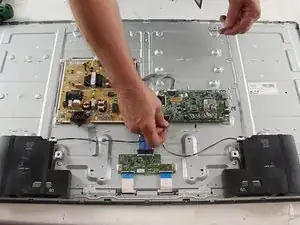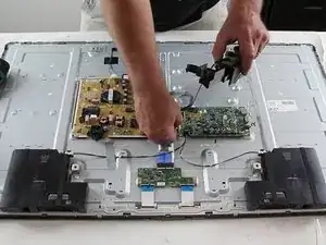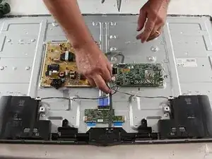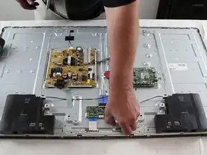 Некоторые из мелких защёлок могут быть расположены под платами; чтобы добраться до как минимум одной из них, потребуется снять плату T‑CON.