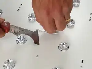 Используйте пятифункциональный инструмент или аналогичный, чтобы отсоединить светодиодные ленты от силовых кабелей и с помощью лопатки поддеть светодиодные ленты, чтобы вывести их из монтажных держателей на шасси.