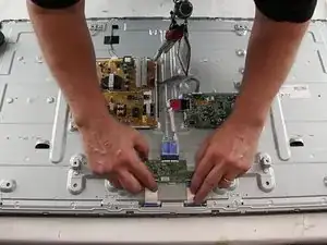 Повторно подключите плату T-CON и плоские ленточные шлейфы, как они были отключены.