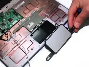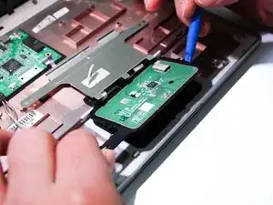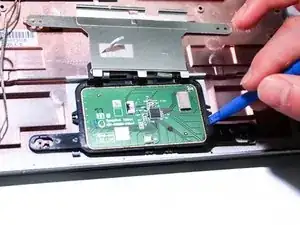 Отсоедините тачпад от шлейфа, который соединяет его с материнской платой, затем используйте пластиковый лопаточный инструмент, чтобы извлечь тачпад.