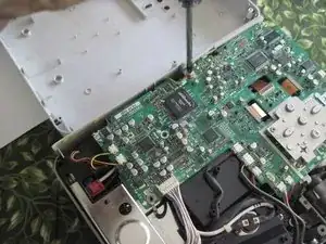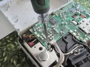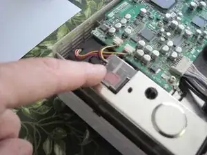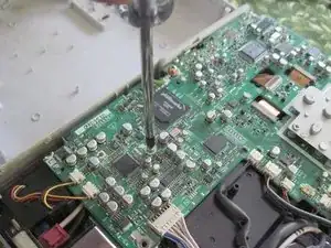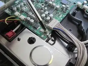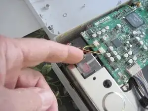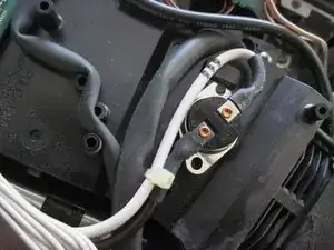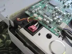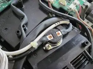 Замените четыре винта, которые Вы сняли с платы в шагах 6 и 7. Помните, один из винтов (под зелёным проводом) больше других. Винт в переднем левом углу, рядом с тепловым предохранителем, также прижимает клемму чёрного провода. Также установите на место прозрачную пластиковую крышку над красным соединителем теплового предохранителя.