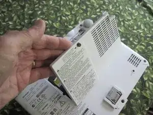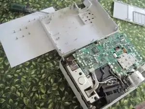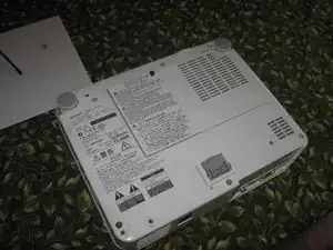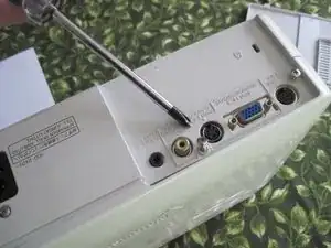 Переверните проектор (верните в рабочее положение). Если вы ещё не вынули шесть винтов из отверстий (открученные на шаге первом), они теперь могут выпасть на стол. Подберите их и сохраните порядок. Осторожно подденьте плоской отвёрткой (или ножом для масла) по стыку между половинками корпуса, пока верхняя часть не отщёлкнется — она крепится на защёлках.