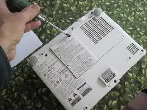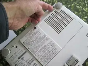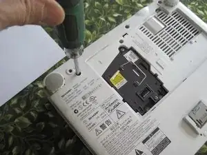 Хотя это и не строго необходимо для этой процедуры, на данном этапе полезно снять панель доступа к лампе. Ослабьте закреплённый винт с крестообразной головкой на краю этой крышки (он чёрного цвета), затем, нажав защёлку пальцем, откройте крышку как дверь.