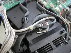 Рабочая часть термопредохранителя устанавливается обратно на чёрный корпус вентилятора. Одна «ушко» защёлкивается под чёрную пластиковую скобу. Другое «ушко» закрепляется винтом, который вы сняли на шаге 8.
