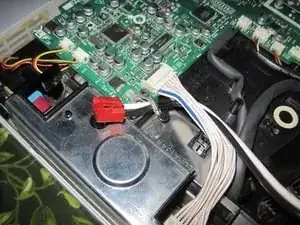 Деталь, которую мы заменяем — термопредохранитель — представляет собой серебристую «пятку» с одним чёрным и одним белым проводом, подключёнными к ней. Оба провода подключаются к шасси на этом красном разъёме. Снимите прозрачную пластиковую крышку плоской отвёрткой.