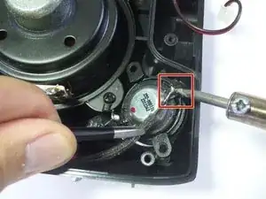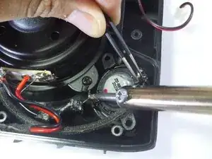 Одновременно отпаяйте тонкий серебристый соединительный провод паяльником и поднимайте твитер от устройства, используя плоские пинцеты.